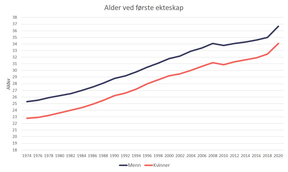 En av de viktigst trendene blant unge voksne er at giftermålsalderen har steget kraftig. I 1975 var gjennomsnittlig alder ved første ekteskap 22,8 år for kvinner og 25,3 år for menn. Siden har det vært en jevn økning, og i 2020 hadde gjennomsnittsalderen økt til 34,1 år for kvinner og 36,7 år for menn (SSB, 2022f).