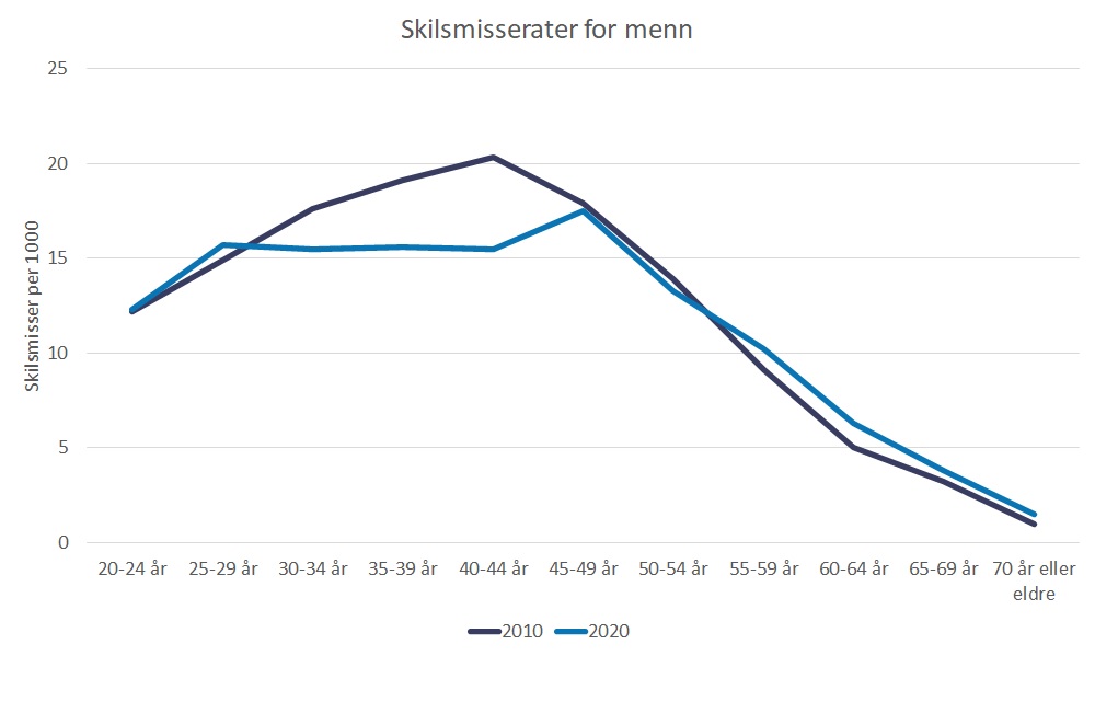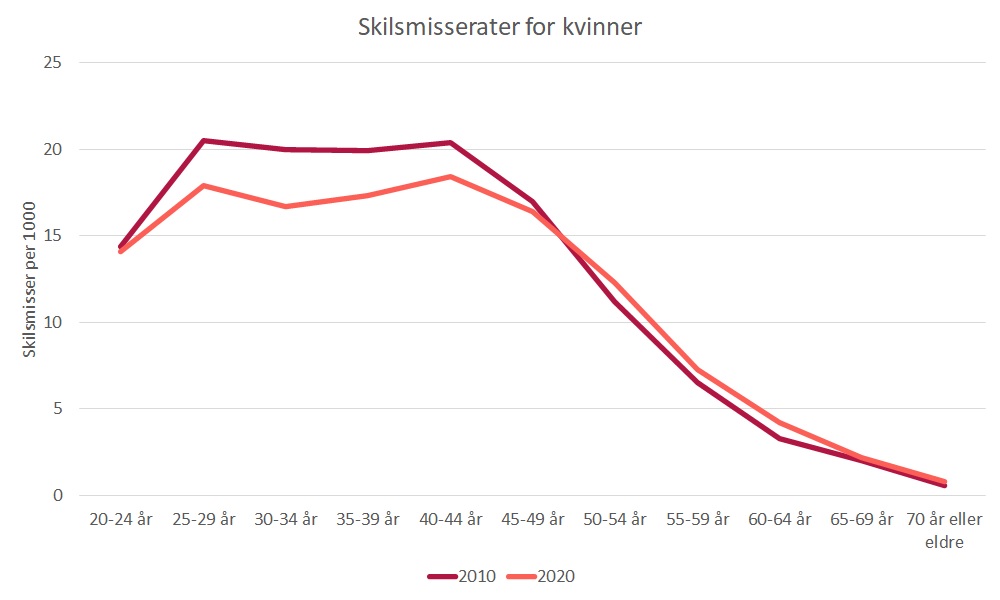 Skilsmisseratene har falt noe de siste årene. Dagens skilsmissetall peker mot at cirka 30 prosent av alle ekteskap vil bli oppløst. I 2010 var tilsvarende tall over 40 prosent. Figur 5a viser aldersspesifikke skilsmisserater blant menn i 2011 og 2021. Vi ser at skilsmisseratene er lavere blant dem i 30- og begynnelsen av 40-årene i 2021 enn i 2011. Figur 5b viser tilsvarende tall for kvinner. Vi ser en nedgang i skilsmisseratene blant kvinner, særlig mellom 25 og 45 år (SSB, 2022e).
