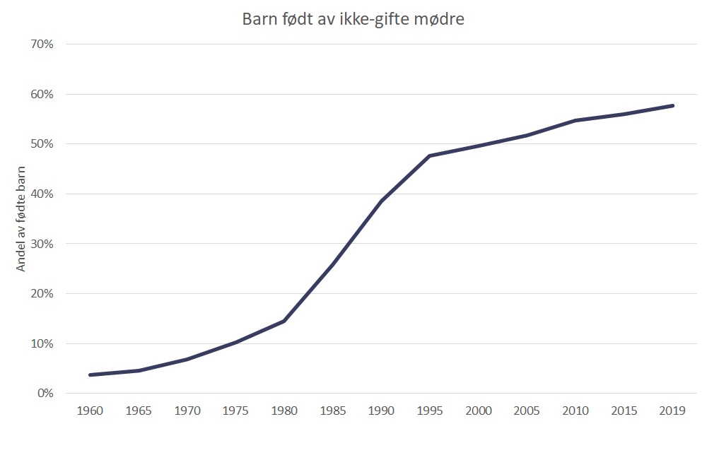 Andelen barn som er født utenfor ekteskap, har økt sterkt. Den utgjør nå 62 prosent av alle fødte, og nesten 70 prosent av alle førstefødte. Derimot lever de aller fleste nye mødre i et samboerforhold. Kun 10 prosent av barna født i 2021 ble født av enslige kvinner (SSB, 2022d).