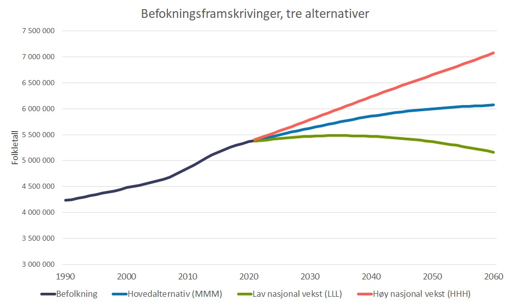 - Hovedalternativet: Her er det antatt at fruktbarheten vil stige gradvis fra dagens nivå fram til 2036 for deretter å ligge på 1,7, en økning i levealderen til 91 år for kvinner og 89 år for menn i 2060, og stabil nettoinnvandring på 10 000-12 000 per år. Ifølge denne framskrivingen vil folketallet øke til 5,9 millioner i 2040 og 6,1 millioner i 2060.