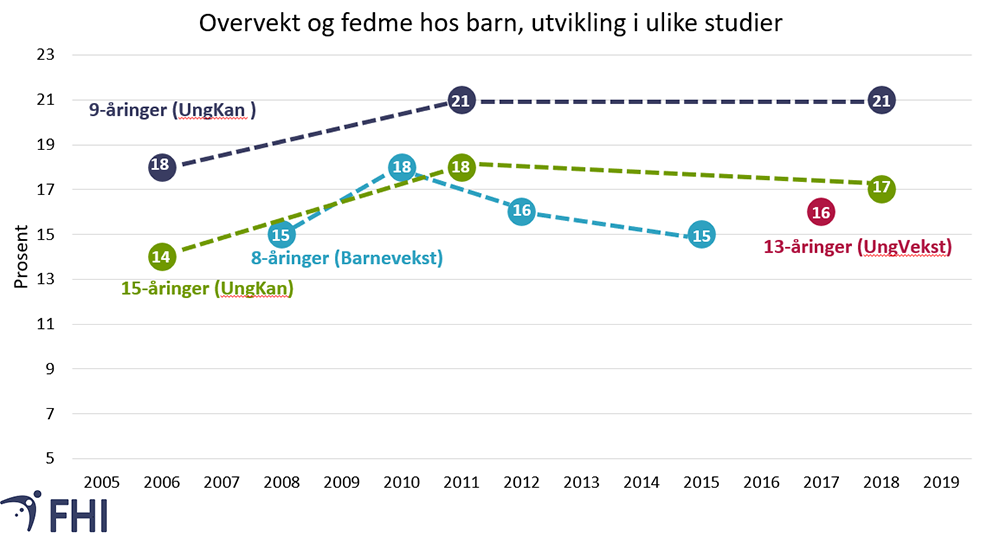 Andelen barn med fedme og overvekt økte over tid fram til begynnelsen av 2000-tallet (Juliusson et al., 2007). Deretter ser den ut til å ha vært stabil. I befolkningsundersøkelser som er utført i perioden fra 2006 til 2018, hvor vekt og høyde er målt, har andelene med overvekt og fedme variert fra 14 til 21 prosent blant barn og ungdom i alderen 8-15 år (figur 2). Undersøkelsene er Barnevekststudien (FHI, 2017), Ungvekst (Øvrebø et al., 2021) og UngKan-undersøkelsen (FHI, 2021).