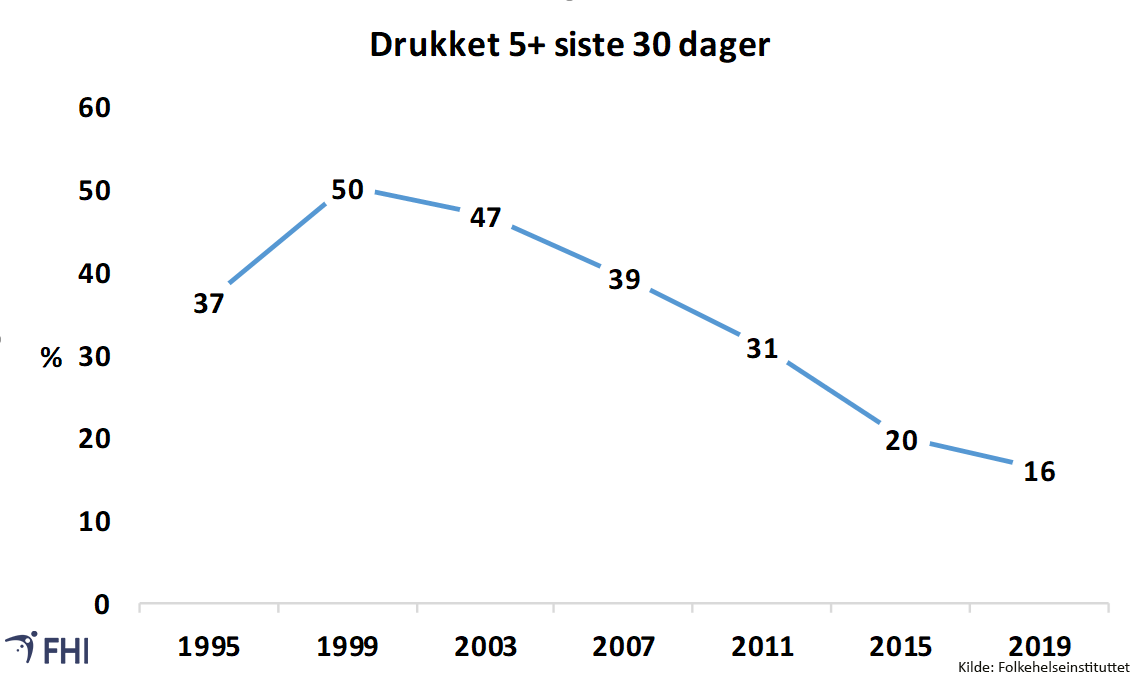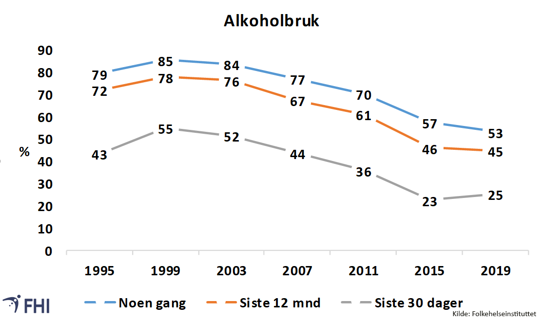 Bruken av alkohol og andre rusmidler er kartlagt blant europeisk ungdom med jevne mellomrom fra 1995 til 2019. Kartleggingene gjennomføres av ESPAD. FHI er ansvarlig for innsamlingen av norske data. Fra 1995 til 1999/2003 var det en liten økning i andelene som oppga at de hadde drukket alkohol noen gang hittil i livet, i løpet av de siste tolv månedene og i løpet av de siste 30 dagene. Etter 2003 har det vært en betydelig nedgang frem til 2019, som vist i figur 3.