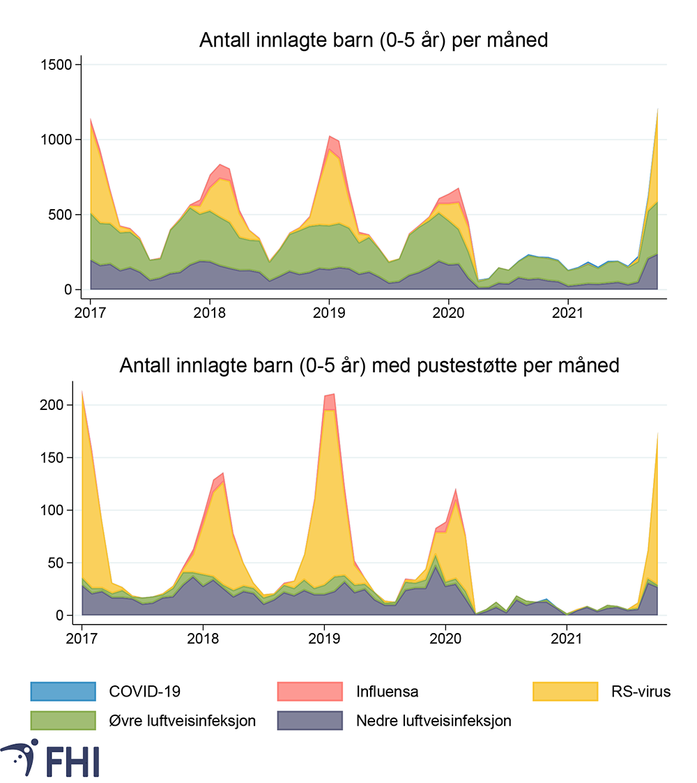 Figur 5 viser hvor mange barn i aldersgruppen 0-5 år som har vært innlagt på sykehus på grunn av luftveisinfeksjoner fra januar 2017 til oktober 2021 (øverste panel) og hvor mange som har trengt respirator eller annen pustestøtte under innleggelsen. Tallene kommer fra beredskapsregisteret som ble etablert under pandemien (Beredt C19). Før pandemien var det stabil sesongvariasjon med en topp på 800-1000 innleggelser per måned ved hvert årsskifte. Under koronapandemien ble antall innleggelser betydelig lavere, og sesongvariasjonen forsvant. Dette skyldes de omfattende kontaktreduserende tiltakene som ble innført. Høsten 2021 kom det en bølge av innleggelser med luftveisinfeksjoner, hovedsakelig på grunn av RS-virus. Bølgen kom mye tidligere på høsten enn vanlig for RS-virus. Fra uke 30 til 51 var det 2507 innleggelser for RS-virus i alderen 0-4 år og 76 innleggelser i alderen 5-17 år. Årsaken var sannsynligvis lettelsen i kontaktreduserende tiltak, samtidig som barna hadde bygget opp en «immunitetsgjeld» etter lang tid med lite eksponering for luftveisvirus (FHI, 2022b).