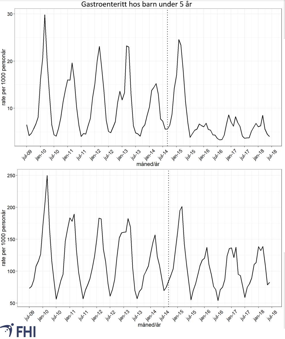 Forekomsten av omgangssyke er høyest i vinter- og vårmånedene. Hos de minste barna kan omgangssyke, spesielt med rotavirus, føre til uttørring og behov for sykehusinnleggelse. I figur 6 (panel A) viser vi innleggelsesrate (antall innleggelser per 1000 person-år) for gastroenteritt fra sommeren 2009 til sommeren 2018. I panel B viser vi antall konsultasjoner per 1000 person-år i primærhelsetjenesten. Etter innføring av rotavirusvaksine i barnevaksinasjonsprogrammet (2014) ble innleggelser på grunn av gastroenteritt nærmest halvert for barn under 5 år sammenlignet med tidligere år (Bruun et al., 2021). I primærhelsetjenesten ble det derimot kun sett en beskjeden nedgang på rundt 10 % i antall konsultasjoner på grunn av gastroenterittsymptomer (Bruun et al., 2021). Dette tyder på at vaksinen førte til en lett reduksjon i forekomsten av mild gastroenteritt, men betydelig reduksjon i alvorlige tilfeller med behov for sykehusinnleggelse.