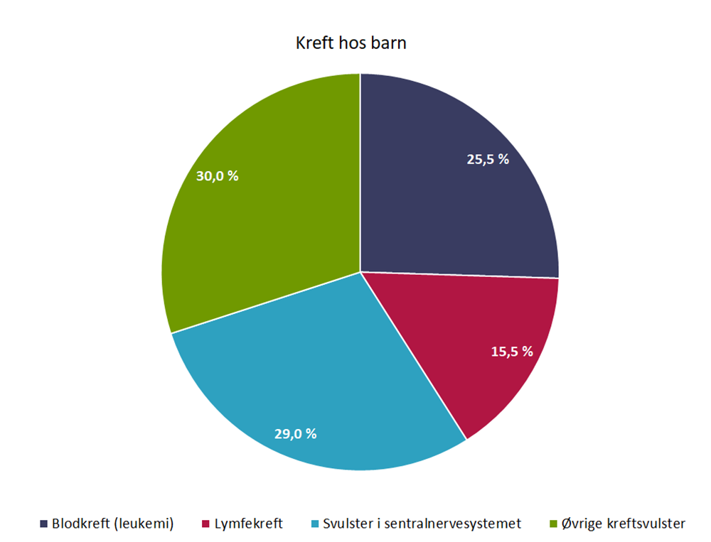 Som vist i figur 7, er blodkreft (leukemi) og svulster i sentralnervesystemet (hjerne og ryggmarg) de vanligste kreftformene, og de utgjør en knapp tredjedel hver. Kreft i lymfecellene (lymfekreft) utgjør cirka 15 prosent. Den siste tredjedelen består av en rekke sjeldne krefttyper hvor antall tilfeller er svært lavt for hver enkelt type.