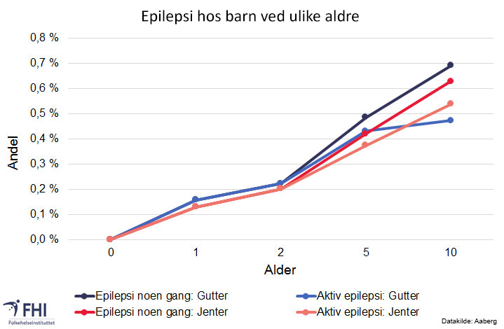 - Ved ti års alder er det 0,7 prosent som har eller har hatt epilepsi (figur 8). Andelen barn med aktiv epilepsi er om lag 0,5 prosent i aldersgruppen sju år og eldre.