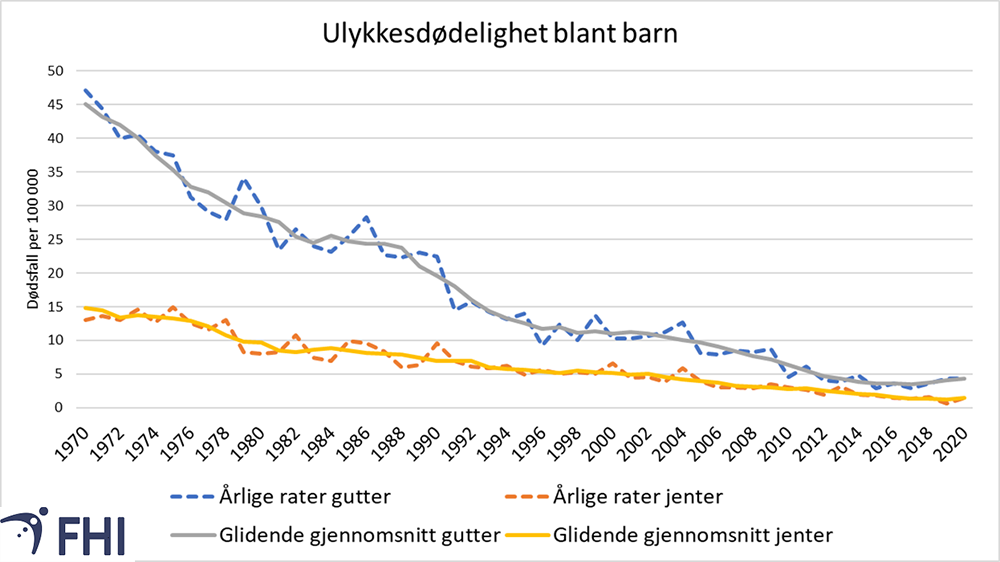 Imidlertid har det de siste tiårene vært en formidabel nedgang i barnedødelighet som følge av ulykker, som vist i figur 9. Siden starten av 1970-tallet har ulykkesdødeligheten blitt redusert med omtrent 90 prosent for både gutter og jenter. Fremdeles dør det flere gutter enn jenter i ulykker.