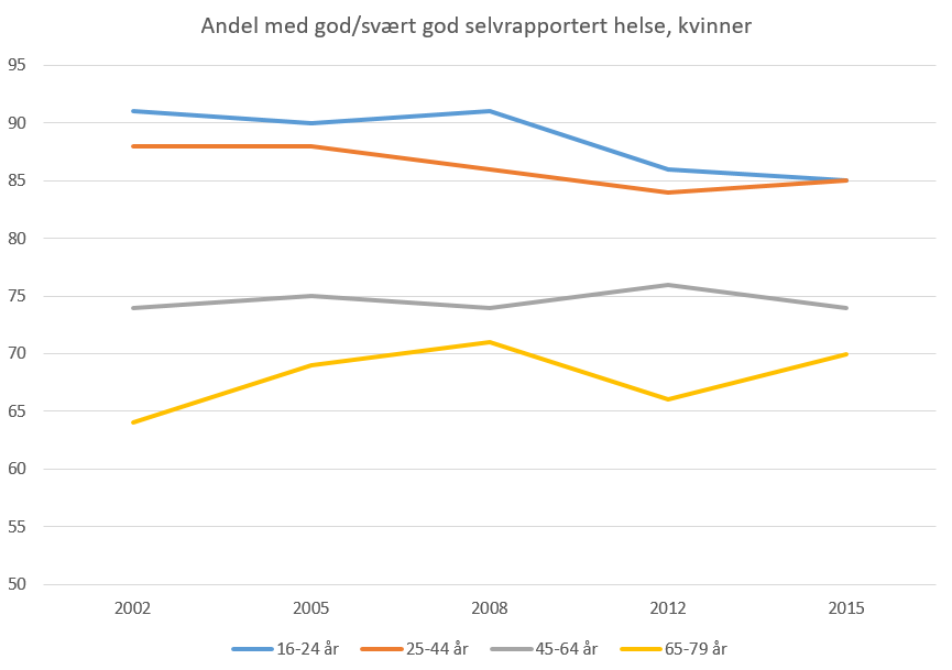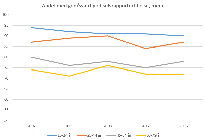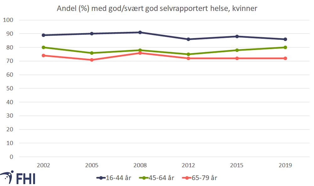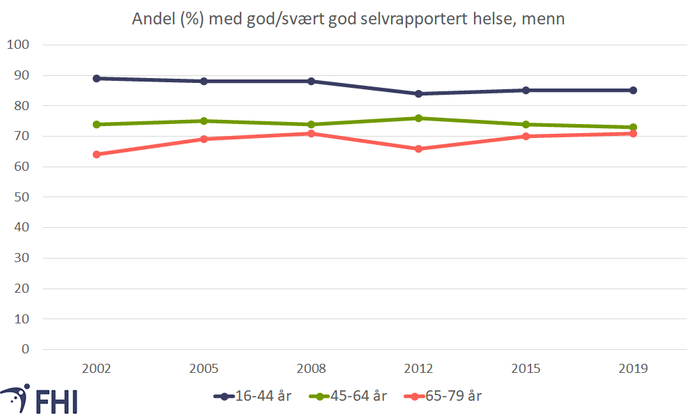 Når det gjelder selvrapportert helse blant eldre, var det små endringer i perioden 2002–2019, se figur 4a og 4b. Blant dem mellom 65 og 79 år rapporterer om lag 70 prosent god eller svært god helse. Det gjelder både menn og kvinner.