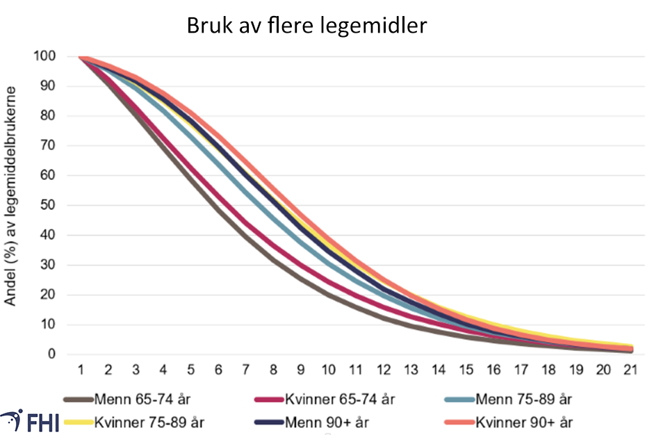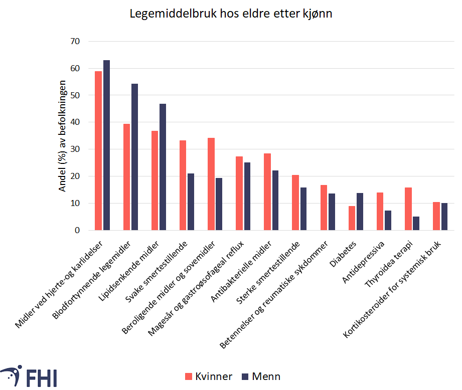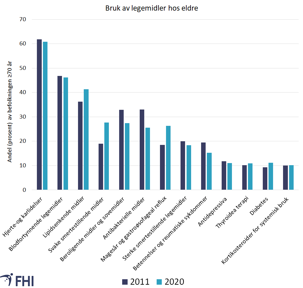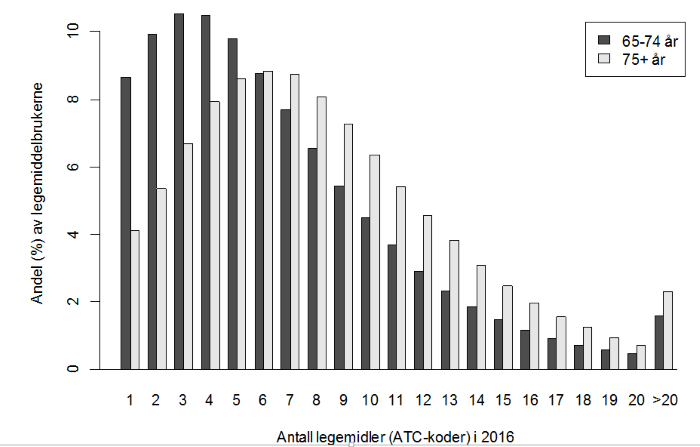 Legemiddelbruken øker med alderen (FHI, 2012). Tall fra Reseptregisteret viser at i 2020 fikk 91 prosent av alle over 65 år minst ett legemiddel på resept, sammenliknet med 65 prosent av de under 65 år (tallene fra Reseptregisteret omfatter ikke legemidler til personer på sykehjem eller sykehus). Tall fra Reseptregisteret viser at eldre i hovedsakelig bruker legemidler ved: