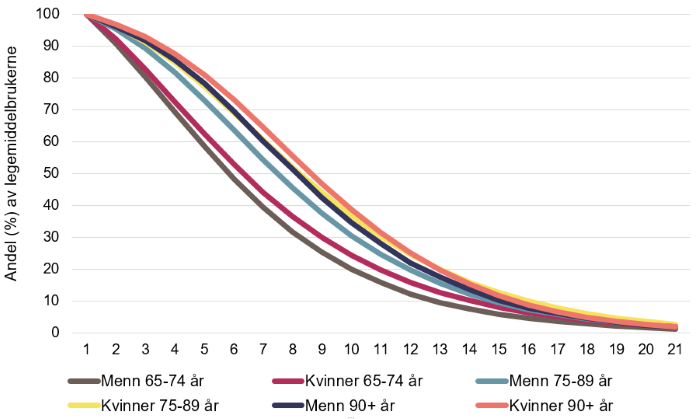 I den eldste aldersgruppen (over 90 år) hadde 81 prosent av kvinnene og 78 prosent av mennene flere legemidler, se figur 11.