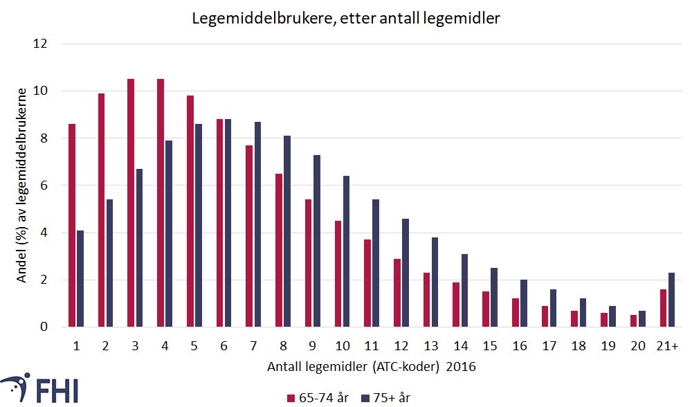 - 28 prosent av legemiddelbrukerne over 65 år brukte 10 eller flere legemidler.