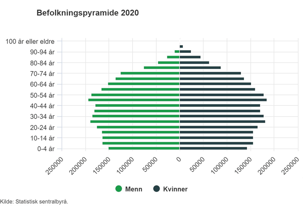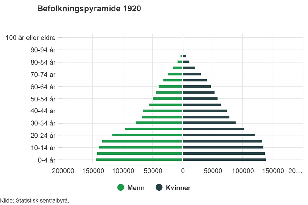 I løpet av de siste 100 årene har befolkningssammensetningen endret seg betydelig. I 1920 var det størst antall yngre, men i 2020 var en større andel eldre og middelaldrende, se figur 1a og 1b nedenfor. Økning i antall eldre over tid skyldes både at fruktbarheten i befolkningen har falt, og at dødeligheten er redusert, spesielt blant eldre.