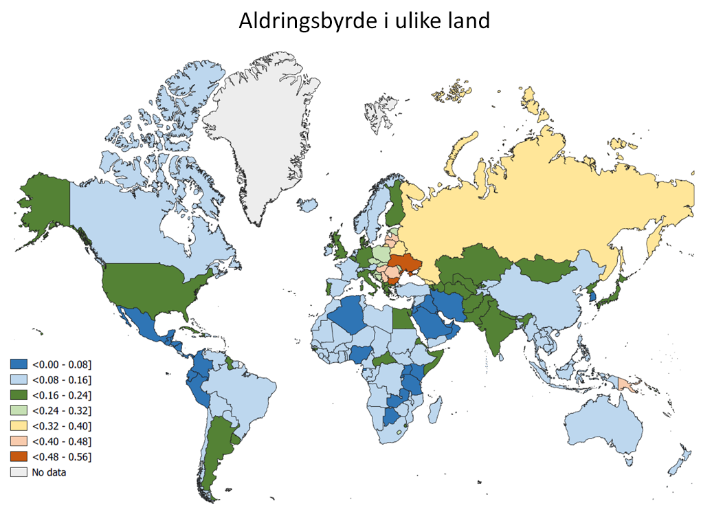 Eldrebrøken (OADR) overvurderer aldringsbyrden i mange demografisk eldre land, og undervurderer aldringsbyrden i mange demografisk yngre land (se figur 2). Norge er relativt ungt demografisk, mens mange land som har en yngre aldersstruktur, slik som India, USA, Pakistan, Nepal, Egypt, den Sentral Afrikanske Republikk, Kasakhstan, Papa New Guinea og Argentina har en høyere aldringsbyrde når også helse tas i betraktning (Skirbekk et al., 2022) (Se figur 2). Det antyder at Norge er et relativt ungt land på grunn av god helse, noe som til dels kan skyldes relativt høye helserelaterte investeringer.