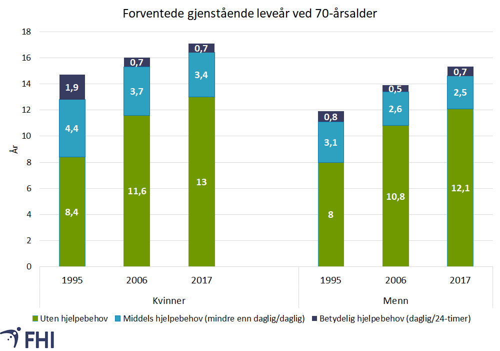 En av disse nye studiene viser at eldre i Norge er selvhjulpne lenger enn tidligere, til tross for økt levealder. Tall fra Helseundersøkelsen i Trøndelag kombinert med tall fra SSB viser at leveår uten hjelpebehov etter fylte 70 år økte med om lag fire år i perioden 1995-2017, mens år med hjelpebehov gikk litt ned. Med andre ord ser det ut til at økningen i forventet levealder også følges av flere funksjonsfriske år. Dette gjaldt både for kvinner og menn (Storeng et al., 2021) (figur 3). Mange eldre fungerer godt i dagliglivet, og de nye forskningsfunnene tyder på at eldre kan leve selvstendige liv ved stadig høyere alder.