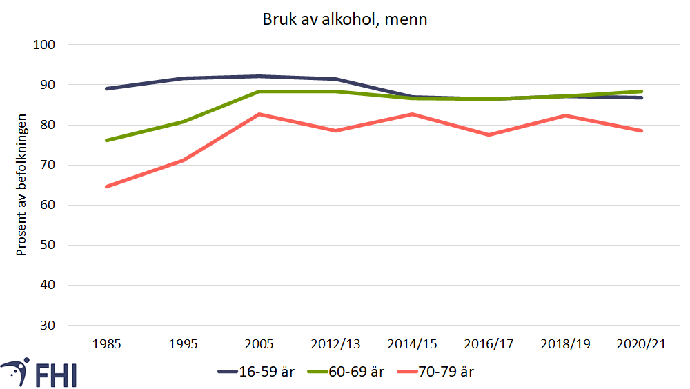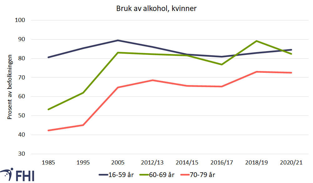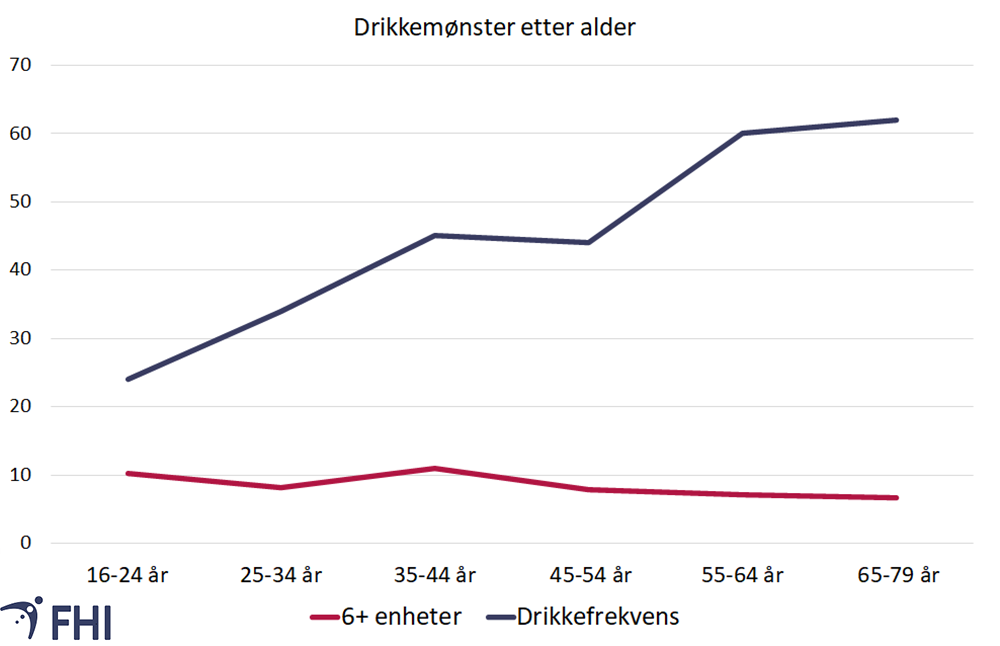 Ulike befolkningsundersøkelser viser at det er flere eldre som drikker alkohol nå sammenlignet med tidligere, og særlig har andelen eldre kvinner som drikker økt de siste 40 årene (se figur 5). I 2020-2021 oppga rundt 8 av 10 kvinner over 60 år at de hadde drukket alkohol i løpet av det siste året, og det samme gjaldt 9 av 10 menn i samme alder. Eldre har et noe annerledes drikkemønster enn yngre: Gjennomsnittlig drikkefrekvens øker med økende alder mens gjennomsnittlig frekvens for høykonsumsituasjoner (6+ enheter på en gang) synker med økende alder (se figur 6) (Bye & Moan, 2020; FHI, 2019).