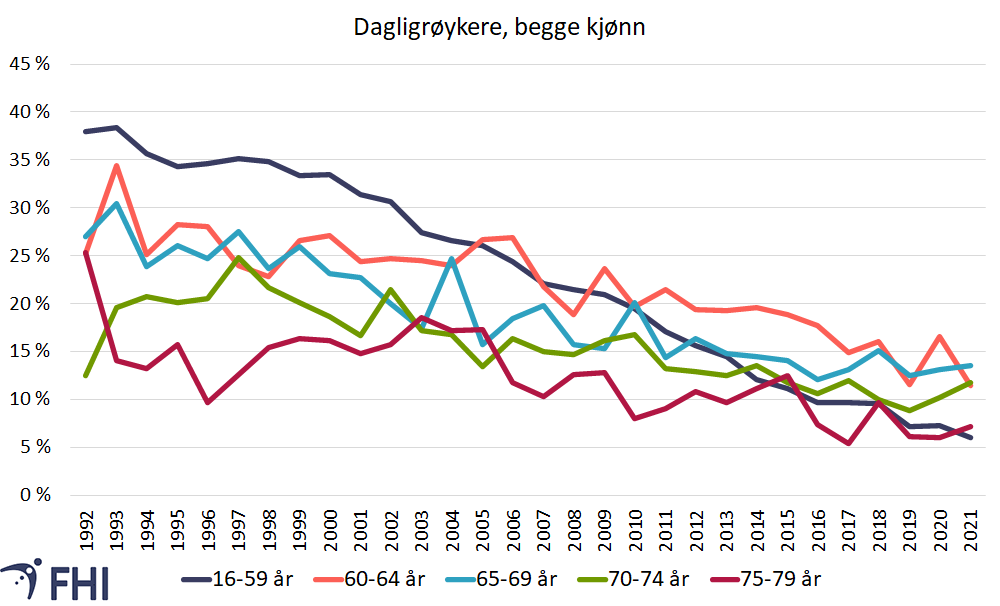 Andelen dagligrøykere har gått ned i alle aldersgrupper, også i de eldre aldersgruppene, men fortsatt er det henholdsvis 14, 12 og 7 prosent dagligrøykere i aldersgruppene 65-69, 70-74 og 75-79 år (se figur 7), se også kapittel om røyking og snusbruk.