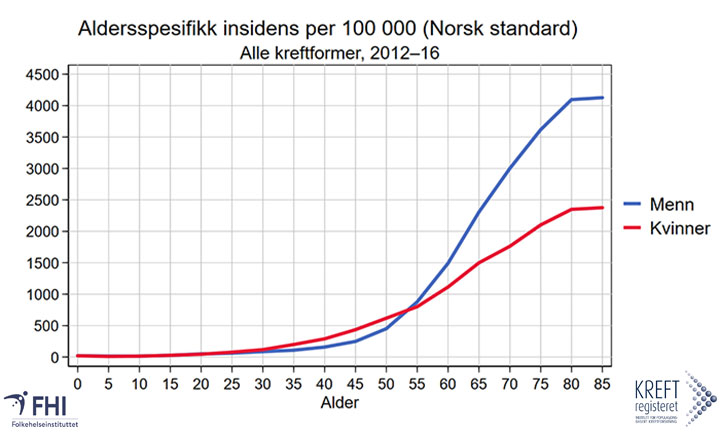 Figur 3 viser antall nye tilfeller av kreft totalt per år per 100 000 for menn og kvinner i ulike aldersgrupper (aldersspesifikk insidensrate). Median alder ved diagnose for alle kreftformer samlet er 71 år. Det betyr at halvparten av alle som diagnostiseres med kreft, er 71 år eller mer.