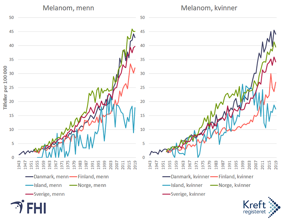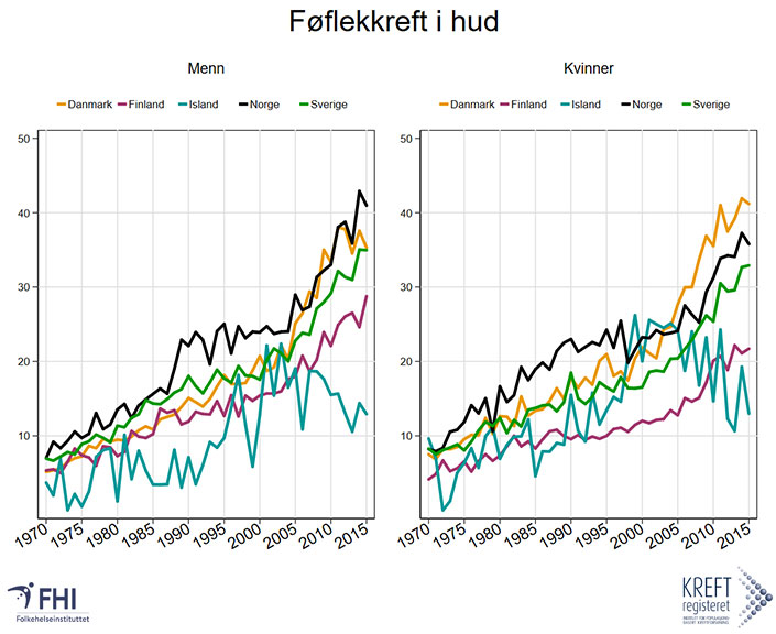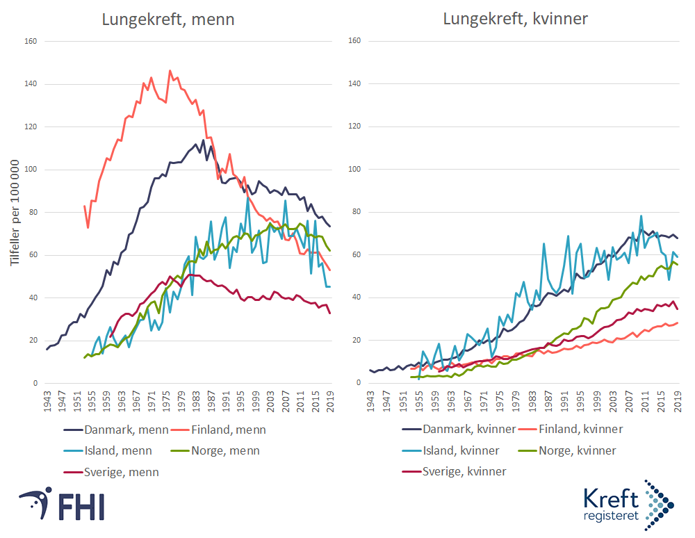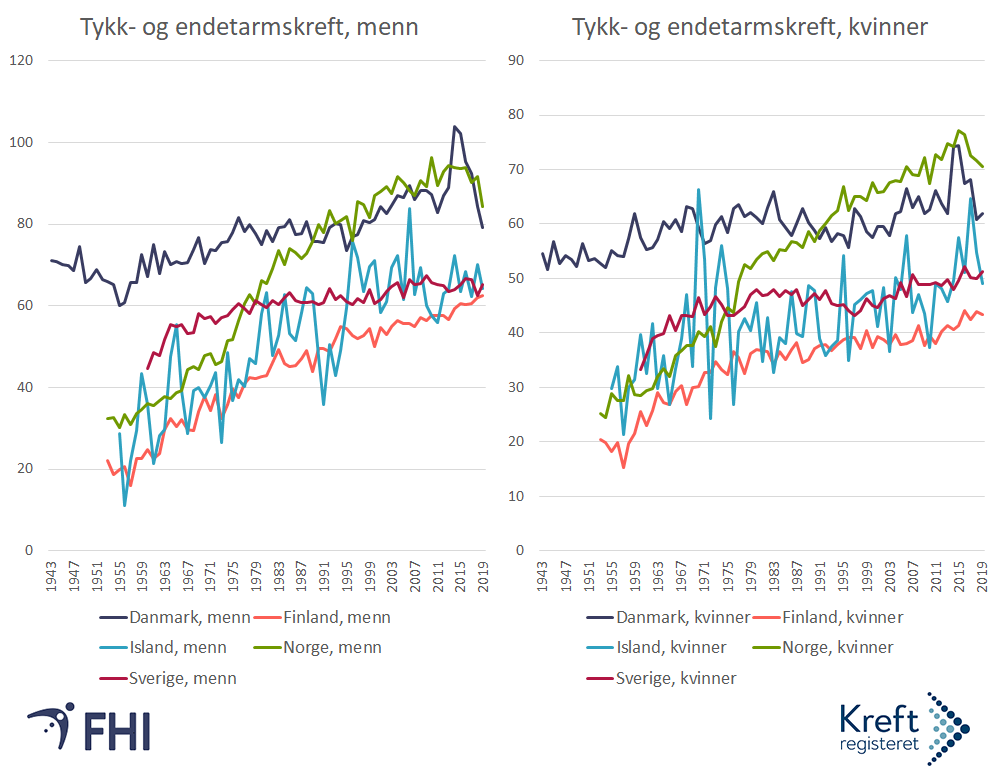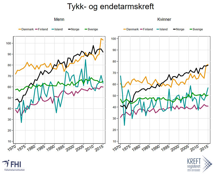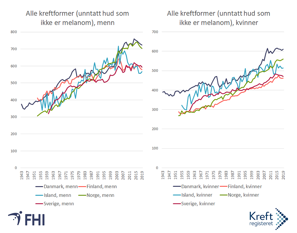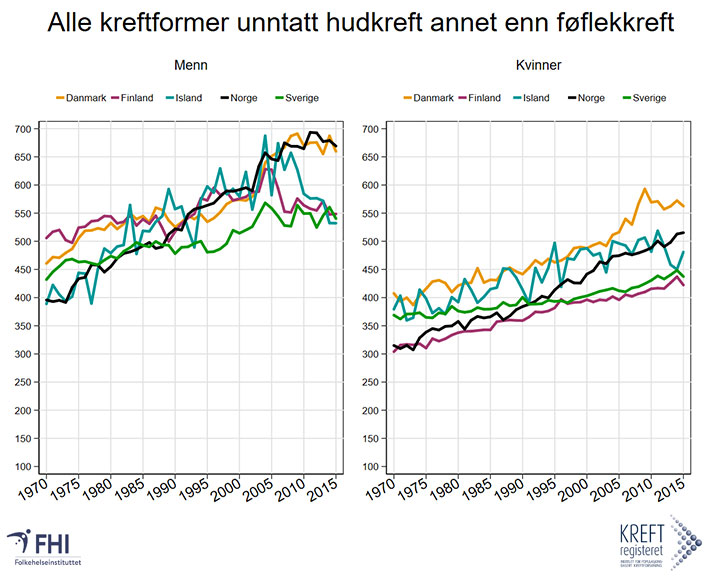 Fra å være det landet i Norden med lavest kreftforekomst på 1950-tallet, har Norge nå, sammen med Danmark, den høyeste kreftforekomsten blant menn, og den nest høyeste forekomsten blant kvinner etter Danmark (figur 8).