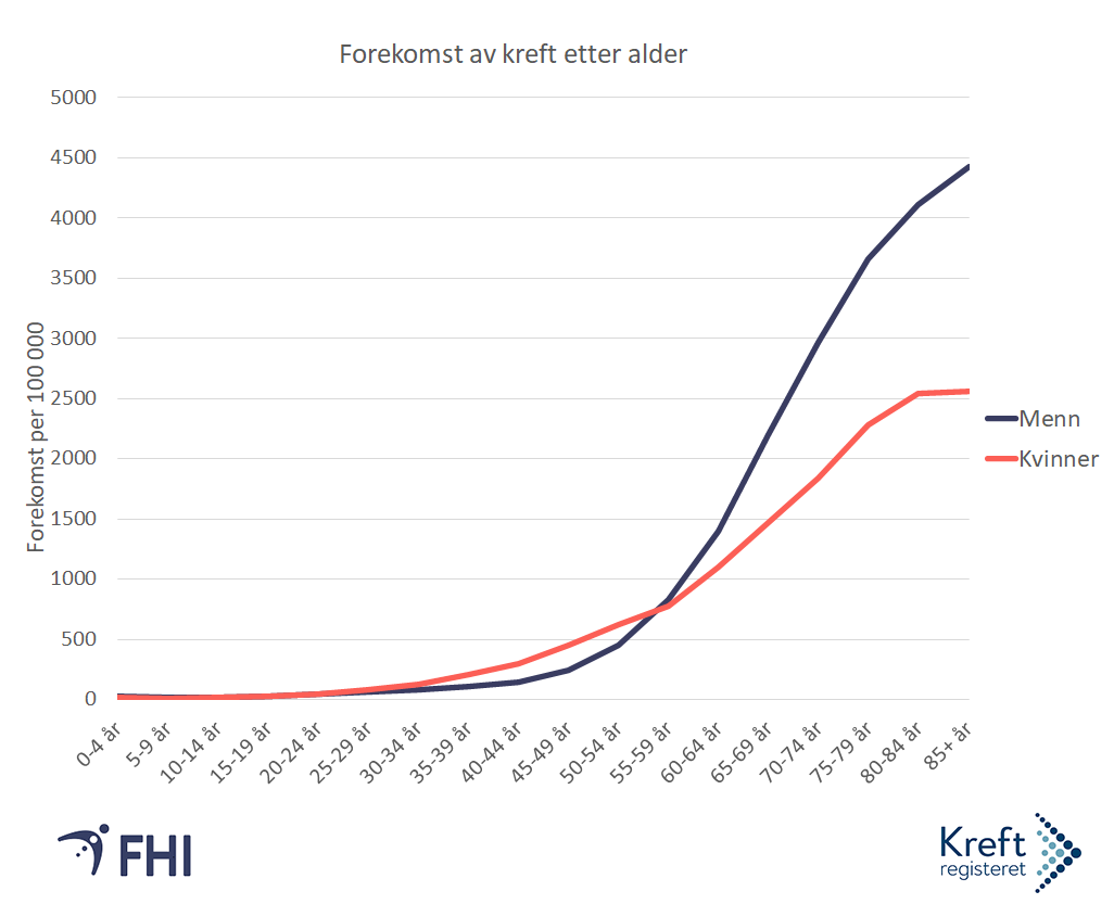 For de aller fleste kreftformene øker risikoen kraftig med alderen, og 87 prosent av krefttilfellene hos kvinner, og 93 prosent hos menn, oppstår blant de som er 50 år eller eldre. Det er kun noen få kreftformer som opptrer hyppigst blant yngre aldersgrupper, deriblant testikkelkreft hvor median alder ved diagnose er 36 år, og livmorhalskreft hvor median alder ved diagnose er 48 år (Cancer Registry of Norway, 2025).
