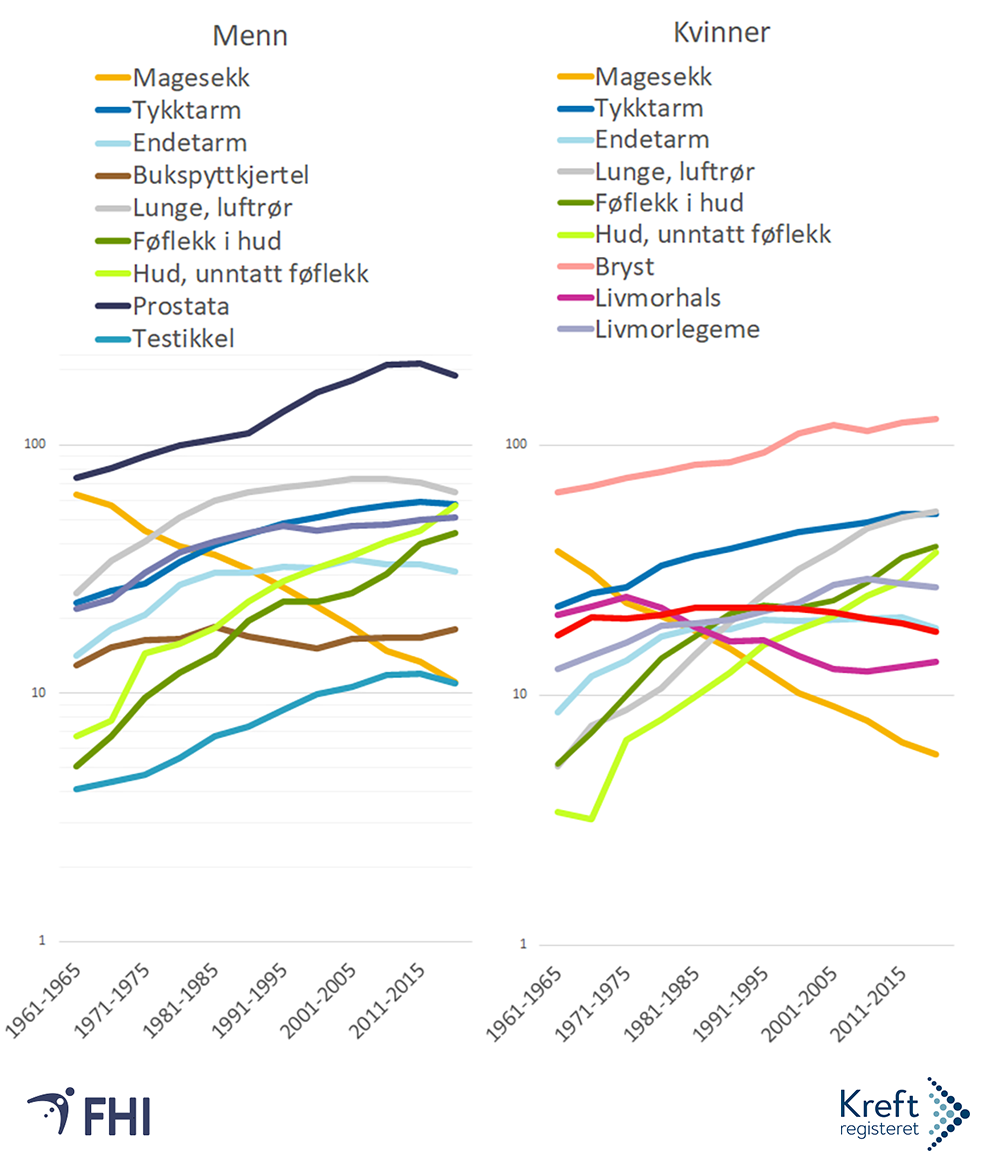 For de aller fleste kreftformene har det også vært en økning i de aldersstandardiserte ratene de siste 70 årene, som vil si at risikoen for kreft har økt. To kreftformer har imidlertid hatt en klar nedgang i forekomsten: Kreft i magesekk var blant de vanligste kreftformene da kreftregistreringen startet i Norge i 1953. Siden den gang har det vært en jevn og stabil nedgang både blant menn og kvinner, og i dag er kreft i magesekk en relativt sjelden sykdom.