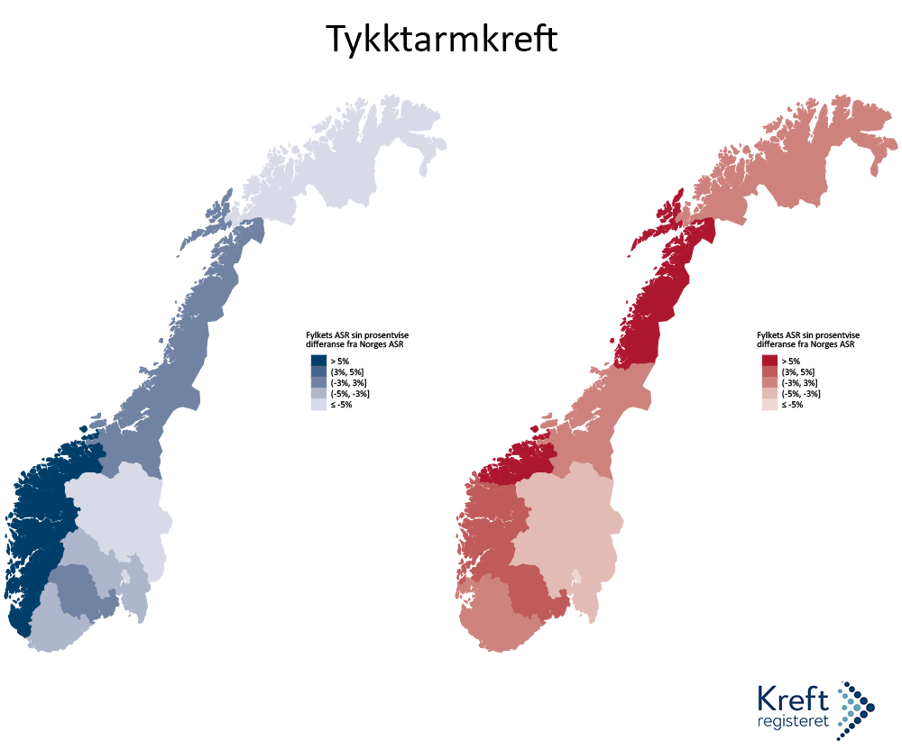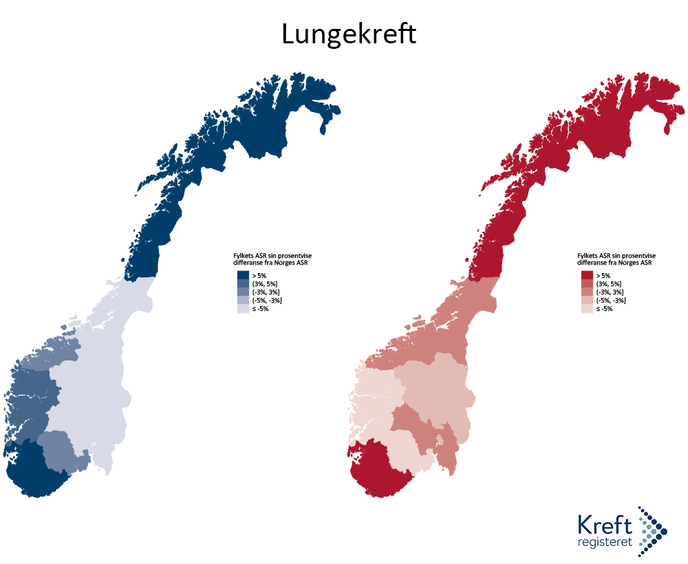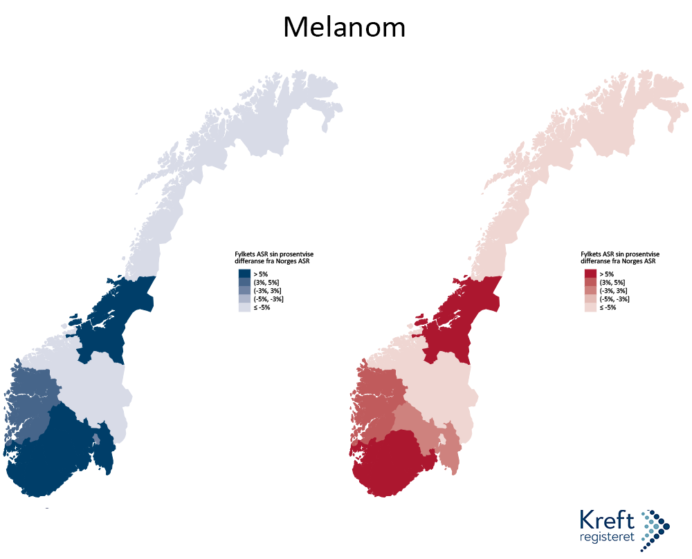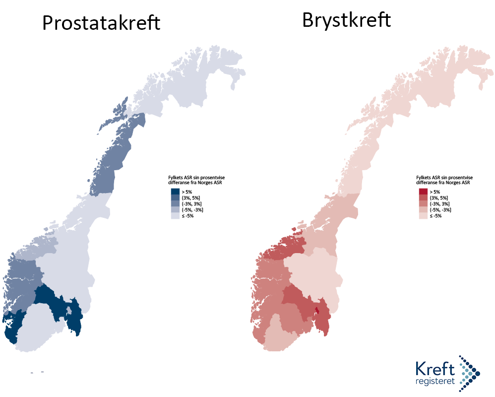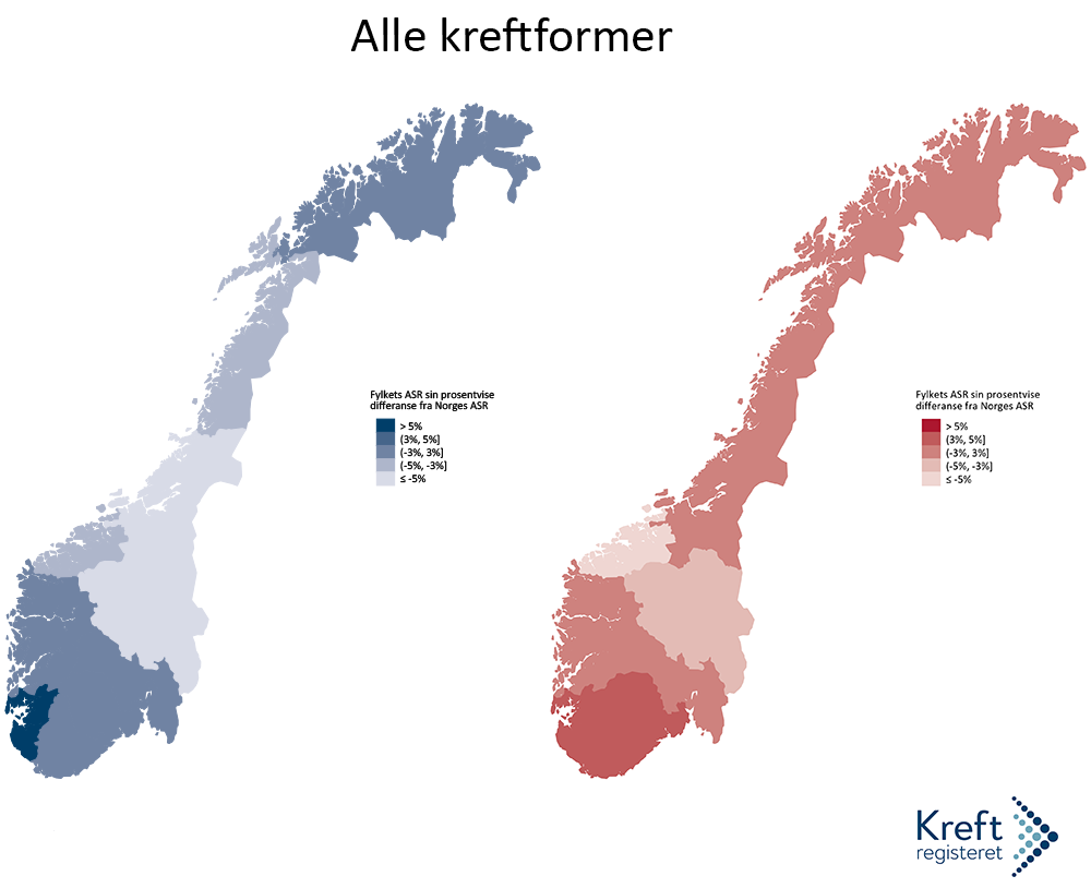 Forekomsten av kreft (målt som aldersstandardiserte insidensrater) varierer mellom fylkene. For all kreft samlet sett er det Rogaland som har den høyeste kreftforekomsten per 100 000 innbyggere blant menn, mens Vestfold har den høyeste forekomsten blant kvinner. Den laveste forekomsten av kreft ses i Finnmark, både for kvinner og menn (figur 7). For mer informasjon om kommune og fylkesinsidens henviser vi til Kreftregisterets statistikkbank.