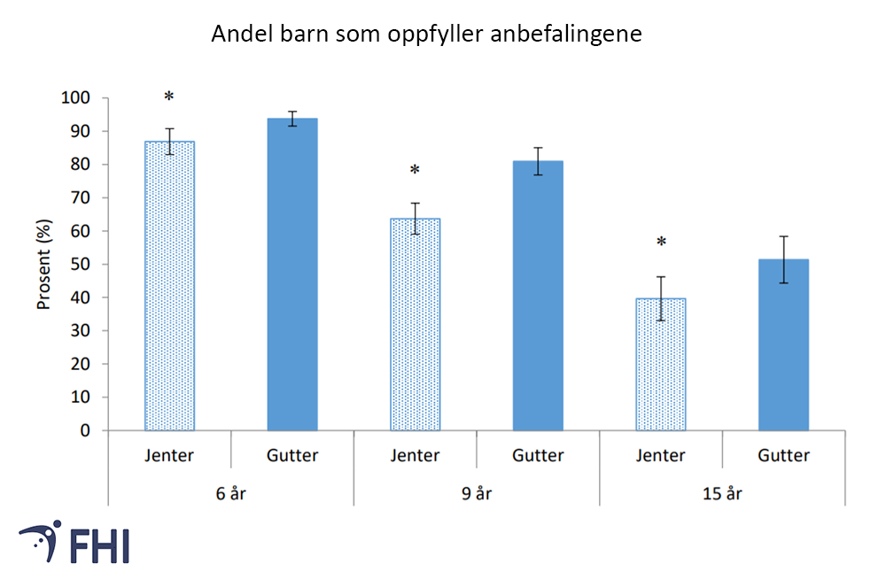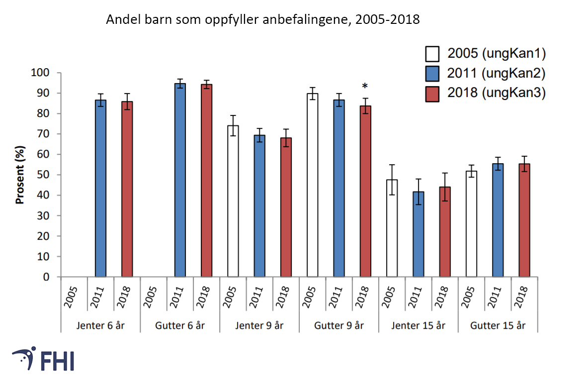 Blant 6-åringene var andelen jenter (87 prosent) og gutter (95 prosent) som oppfylte anbefalingen i 2011 nær identisk som hos jenter (86 prosent) og gutter (94 prosent) i 2018. Blant 9-åringene ser det derimot ut til at andelen som når anbefalingen er i negativ utvikling, med en lavere andel gutter som oppfyller anbefalingen i 2018 (84 prosent) sammenlignet med 2005 (90 prosent). Andelen 9 år gamle jenter som oppfyller anbefalingen ser også ut til å ha falt gradvis fra 2005 (74 prosent) til 2018), men denne trenden er noe mer statistisk usikker.