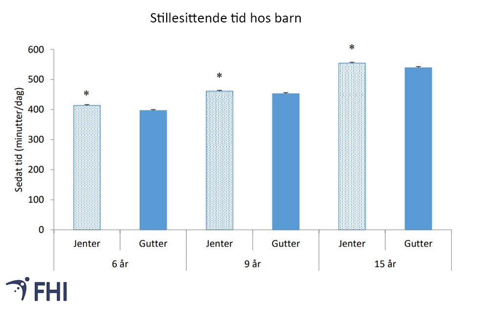 Gjennomsnittlig sedat tid registrert av akselerometrene per dag hos 6, 9 og 15 år gamle jenter og gutter er presentert i figur 4. Sedat tid representerer tid der en er mer eller mindre i ro (sittende, liggende eller stående). Seksåringene bruker om lag 400 min/dag på sedate sysler. De er dermed signifikant mindre sedate daglig sammenlignet med både 9-åringene og 15-åringene, som er sedate i henholdsvis ca. 450 min og 550 minutter daglig.