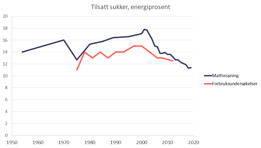 Hvis man ser på matforsyningsstatistikken, har forbruket av tilsatt sukker har gått ned fra 44 til 24 kilo per innbygger per år i perioden 1999 til 2019 (utenom grensehandel). Mellom 2019 til 2020 gikk forbruket opp, og ytterligere noe opp i 2021 (Helsedirektoratet, 2022).