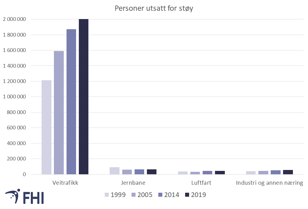 I 1999 var om lag 1,2 millioner mennesker utsatt for veitrafikkstøy i nærhet av boligen som var over anbefalt nivå på 55 dB. Fram til 2019 økte antallet med ca. 800 000 til om lag 2 millioner, en økning på 67 prosent (figur 1). Dette til tross for at det i perioden 2007 til 2020 var en nasjonal handlingsplan mot støy, med mål om å redusere antall støyplagede med 10 prosent. Årsaken til den kraftige økningen i antall støyeksponerte er hovedsakelig befolkningsvekst i støyutsatte områder, i tillegg til trafikkvekst og økt andel tungtrafikk.