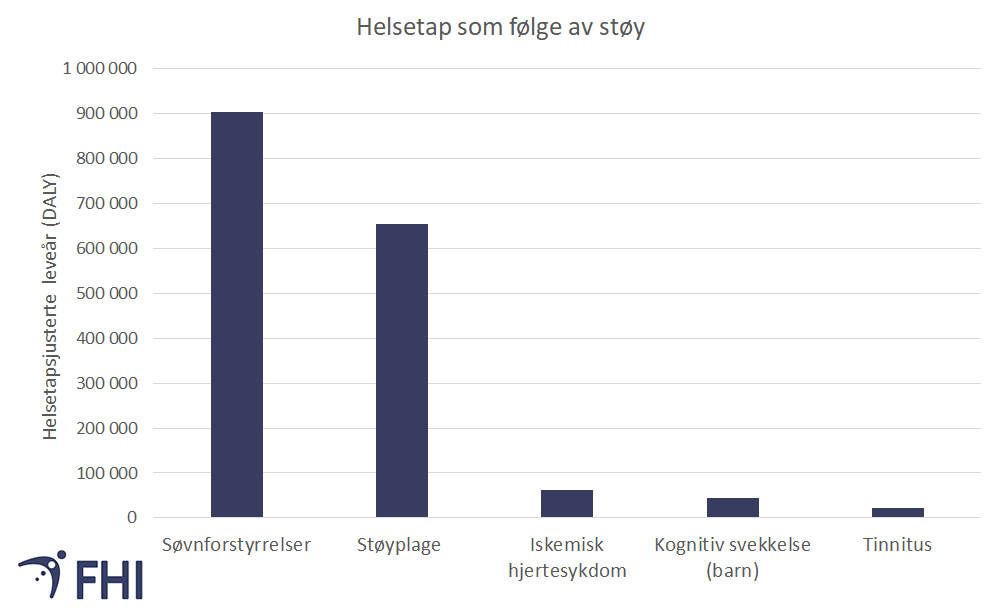 Med unntak av Europa er det ingen systematisk oversikt over antall støyutsatte og hvor mange som opplever støyplager internasjonalt. Ifølge WHO bidrar støy med minst 1 million helsetapsjusterte leveår (DALY) årlig i Vest-Europa (WHO, 2011). Veitrafikk er hovedkilden til støy, og det største bidraget til helsetap er fra støyrelaterte søvnforstyrrelser, se figur 2. Mange opplever også å være støyplaget. En lavere andel av helsetapet (61 000 DALYs) skyldes iskemisk hjertesykdom, det vil si hjerteinfarkt og angina pectoris, som kan tilskrives veitrafikkstøy. Videre har høye nivåer av flystøy utenfor skole konsekvenser for barns kognitive ferdigheter (lesing samt hukommelse), noe som bidrar med 45 000 DALYs i følge WHO. Beregnet helsetap som skyldes tinnitus (figur 2) er svært usikkert og her er det kun fritidstøy som er inkludert i beregningene.