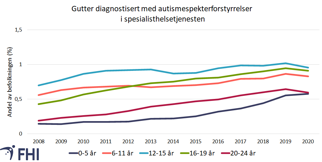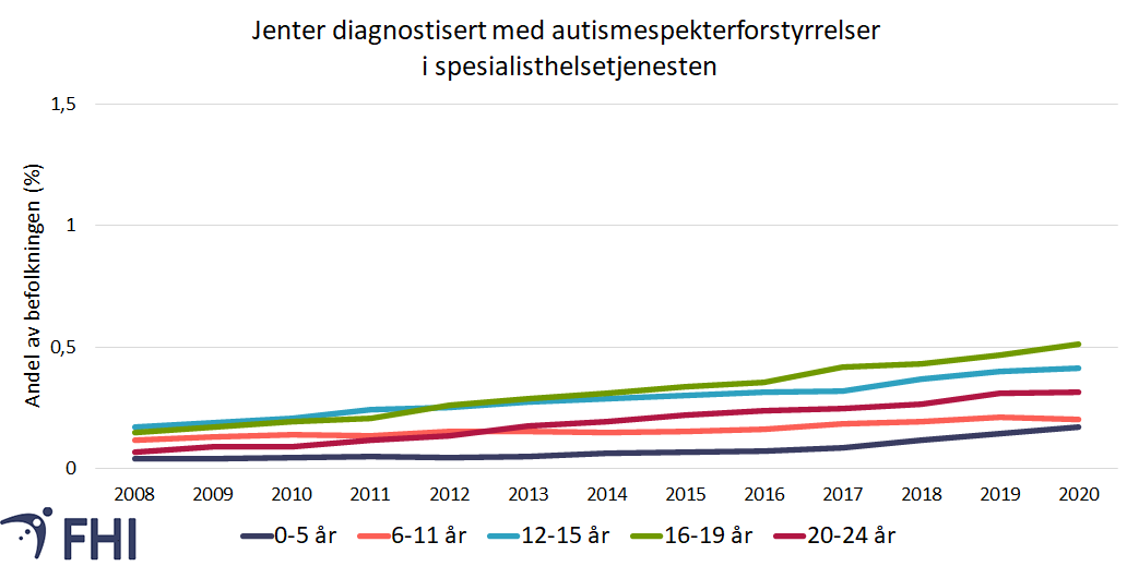 Andelen tenåringsjenter som diagnostiseres med autismediagnoser i spesialisthelsetjenesten er økende. Dette kan tyde på at autismediagnose hos jenter fanges opp i større grad nå enn før, men at det ofte skjer relativt høyt opp i alder.