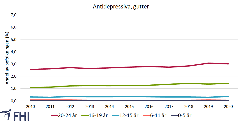- Hos gutter i aldersgruppen 16-19 år har andelen i befolkningen ligget stabilt på rundt 1 prosent over mange år. Som med unge kvinner ser man en svak økning over tid i andelen 20-24 åringer i befolkningen som har fått depresjonsdiagnoser.