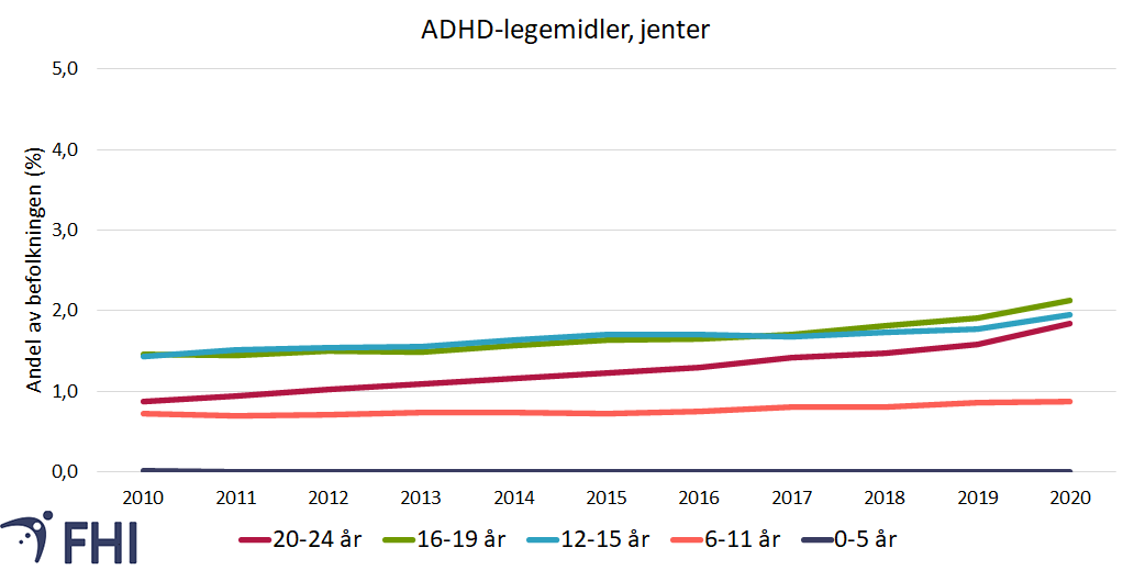 I perioden 2010-2022 har det vært en økning i bruk av ADHD legemidler hos begge kjønn (figur 12). Sterkest økning har det vært blant 20-24 åringer: fra 0,9 prosent brukere i 2010 til 3,0 prosent i 2022 blant jenter og fra 1,0 til 2,5 prosent i 2022 blant gutter. I denne aldersgruppen er det liten kjønnsforskjell i andelen brukere av disse legemidlene. I de yngre aldersgruppene (under 16 år) er det tydelig størst andel gutter som blir behandlet med ADHD-legemidler. Dette samsvarer med at en høyere andel gutter enn jenter i de yngste aldersgruppene blir diagnostisert med ADHD. I 2022 er det høyest andel brukere blant gutter 12-15 år: 5,4 prosent av gutter i denne aldersgruppen ble behandlet med ADHD-legemidler. Blant jenter er det aldersgruppen 16-19 år som har høyest andel brukere: 3,3 prosent. Andelen unge kvinner og menn (20-24 år) som blir behandlet med ADHD-legemidler er omtrent like store.