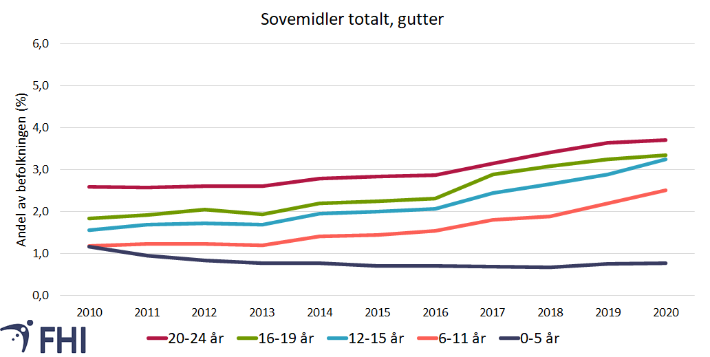 Økende bruk av sovemidler blant barn og unge, som i hovedsak skyldes melatonin, er observert i alle skandinaviske land (Wesselhoeft et al., 2021). Det er imidlertid variasjon mellom landene, og økningen har vært dobbelt så høy i Sverige sammenlignet med Norge og Danmark.