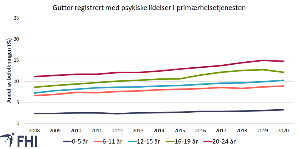 - Blant gutter har andelen som blir behandlet for psykiske lidelser vært mer stabil. Blant de yngste aldersgruppene (0-11 år) er andelen som blir behandlet for psykiske lidelser høyere hos gutter enn jenter. Dette skyldes at gutter i større grad utvikler lidelser som debuterer tidlig i livet, som for eksempel ADHD, autismespekterforstyrrelser og atferdsforstyrrelser.