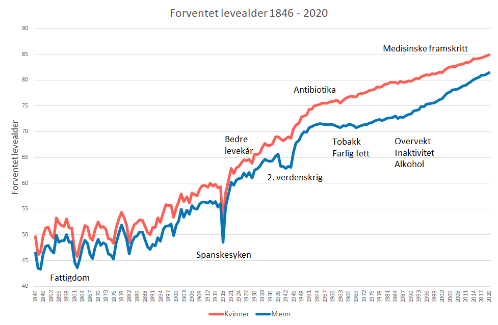 - Forventet levealder har økt mer eller mindre kontinuerlig fram til 2020, bare avbrutt av verdenskriger og spanskesyken i 1918.