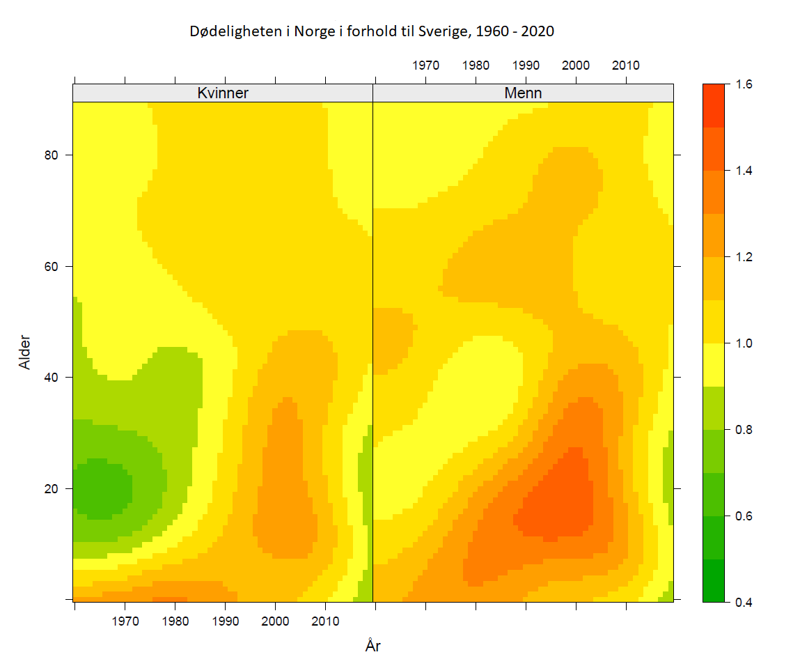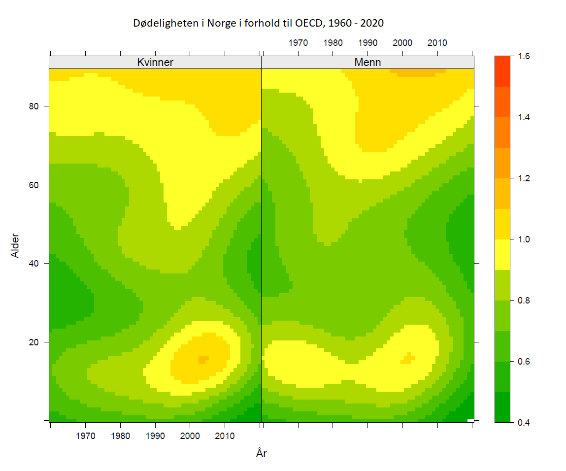 - I figur 9 ovenfor er Norge sammenliknet med OECD. Du finner aldersgrupper på loddrett akse. Vi ser at Norge har lavere dødelighet for de fleste aldersgrupper (dyp grønn) tidlig i perioden, men får en utvikling mot samme og høyere dødelighet enn OECD fram til omtrent år 2005 (fra grønn til gul og oransje for flere aldersgrupper). Med andre ord var dødelighetsnedgangen i disse aldersgruppene svakere enn snittet i OECD. Denne trenden er delvis reversert etter år 2005.