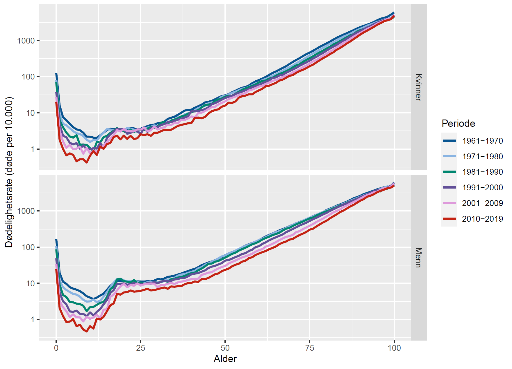 Figuren ovenfor viser dødelighetsrater (døde per 10 000 i ett kalenderår) etter alder i Norge fra 1961 til 2019. Vi ser at:
