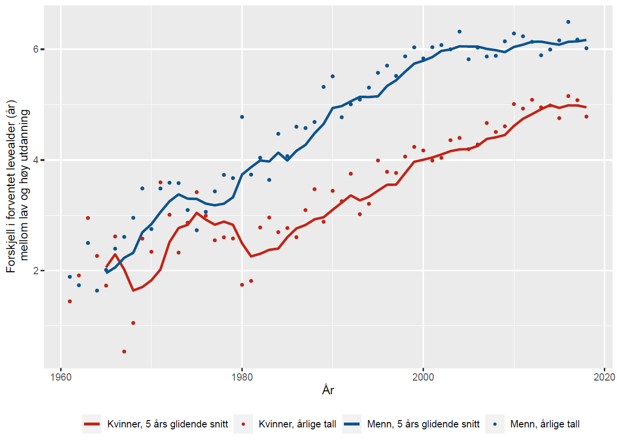 Analyser av data fra 1960 til 2009 viser at det var en nedgang i forventet gjenstående levetid blant menn i gruppene med kortest utdanning i tiåret fra 1960 til 1970 (Steingrimsdottir, 2012). Fra 1970-tallet til 2000 økte levealderen i alle gruppene blant både kvinner og menn, men mest blant dem med lengst utdanning.