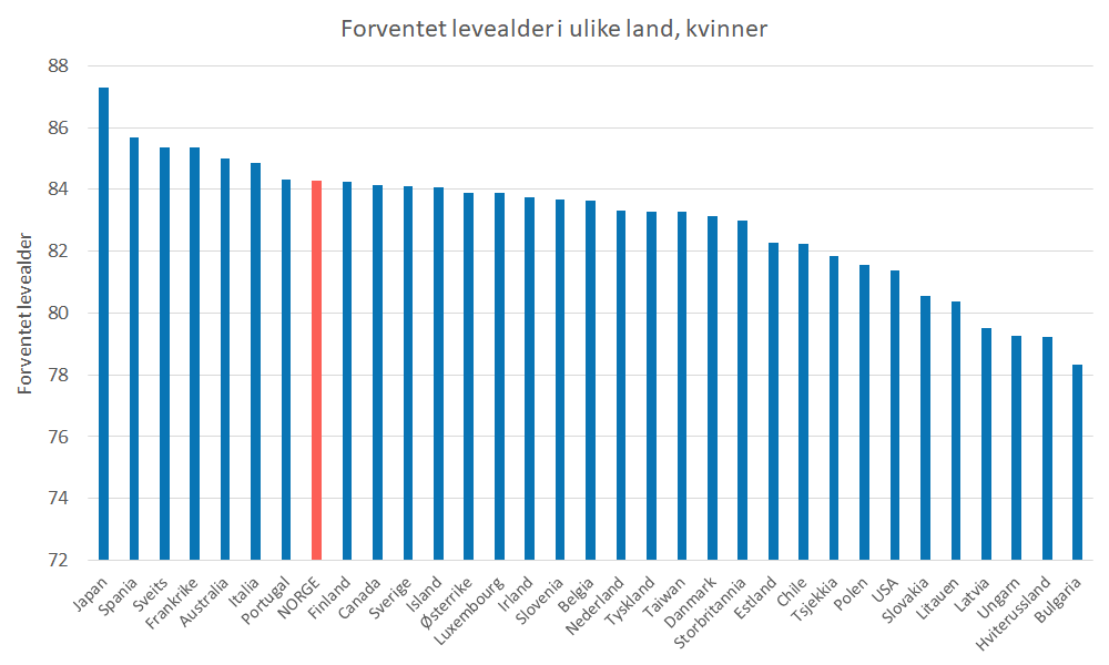 - I 2024 hadde forventet levealder steget til 84,8 år for kvinner mot 81,6 år hos menn.
