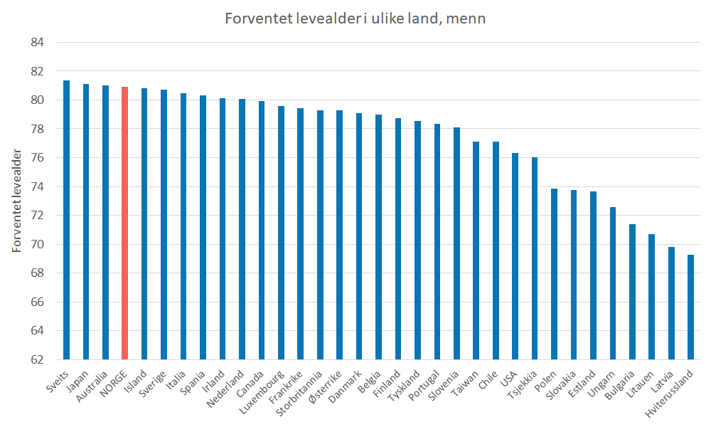 - I perioden fra 1960 fram til i dag har Norge gått fra å ha verdens høyeste levealder til å havne et stykke lenger ned på lista. Dette betyr at utviklingen i dødelighet i Norge har vært mindre gunstig enn i land vi liker å sammenlikne oss med.