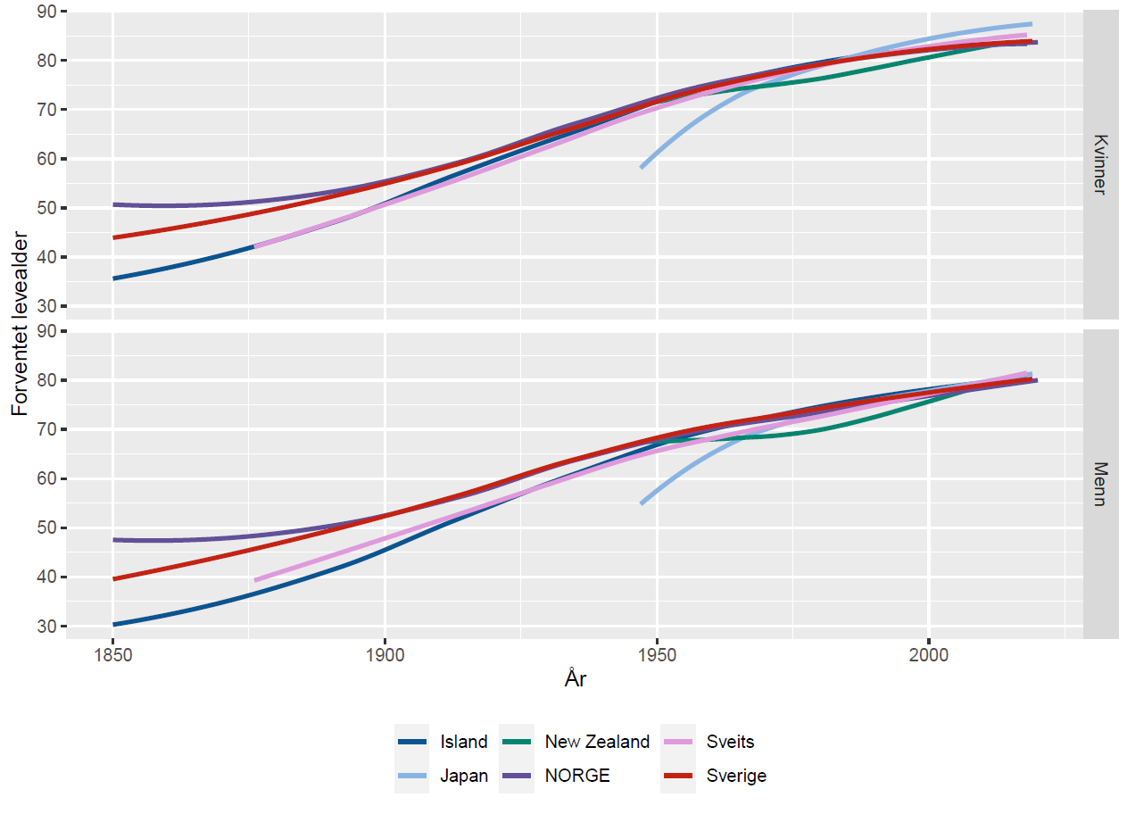 - I perioden 1947-1955 for menn og 1945-1970 for kvinner lå forventet levealder i Norge igjen på verdenstoppen, hårfint foran Sverige (rød linje i figuren). Senere har levealderen steget mindre her til lands enn i flere andre land, inkludert Sverige.
