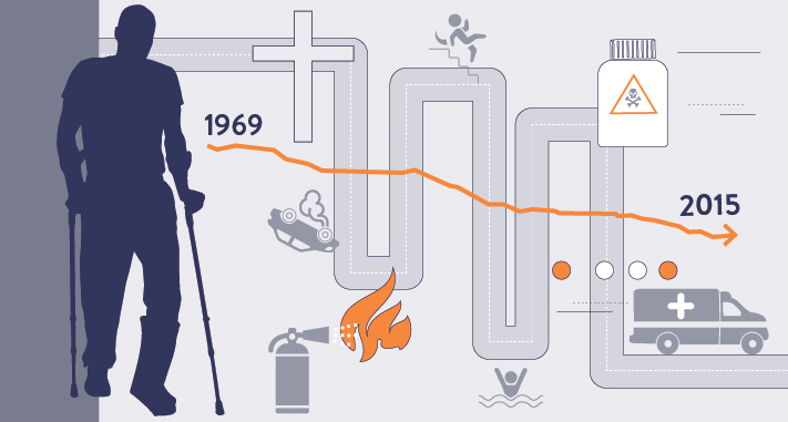 |Det har vært en gledelig nedgang i dødsulykker de siste 40-50 årene, blant annet på grunn av langt færre dødsfall i trafikken. Likevel er skader og ulykker fremdeles en stor utfordring for folkehelsen.