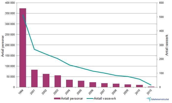 Dei siste 20 åra er det registrert 78 utbrot med totalt 17 000 sjukdomstilfelle. Årsaka er enten forureining av vasskjelda, mangelfull vassreinsing eller forureining på leidningsnettet. Hovudårsaka er manglande, utilstrekkeleg og svikt i desinfeksjon (Hyllestad, 2021). I perioden 2003–2012 er det registrert 28 slike utbrot med til saman 8060 sjuke (Guzman-Herrador et al., 2016).