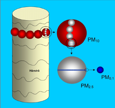 De minste partiklene i PM2,5 fraksjonen (størrelsesorden 0,1-1,0 µm) avsettes imidlertid i liten grad og størsteparten av disse partiklene forsvinner ut av luftveiene ved utpust. Videre vil de aller minste nanopartiklene (< 0,01 µm eller 10 nanometer) hovedsakelig avsettes i nese/svelg [3].