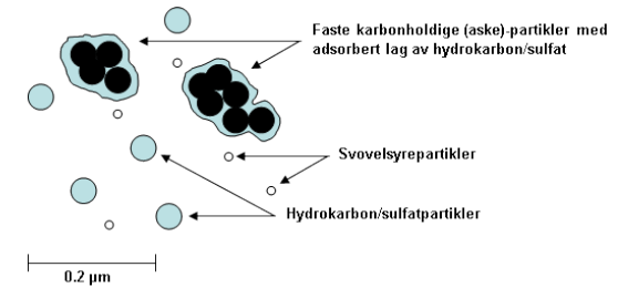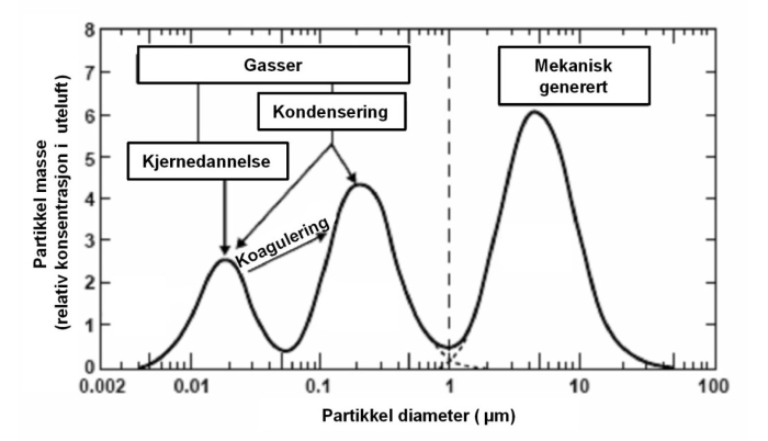 Aitkenpartikler (enkeltkjernepartikler) er primære (nydannete) partikler fra eksos eller lignende forbrenningsavgasser, og består hovedsakelig av partikler med størrelse rundt 0,02 µm (se figur 2). Slike partikler observeres hovedsakelig bare i nærheten av den aktuelle kilden, og vokser raskt og danner akkumulasjonspartikler som utgjør den neste størrelsesfraksjonen. Akkumulerte partikler er gjerne eldre, koagulerte forbrenningspartikler med adsorberte forbindelser, og består hovedsakelig av partikler med størrelse rundt 0,2 µm [2]. Det vil dessuten forekomme noe mekanisk generert støv i PM2,5, selv om partiklene i denne størrelsesfraksjonen i hovedsak betraktes som forbrenningspartikler. Dessuten kan forbrenningsreaksjoner gi opphav til grove partikler i form av større partikkelaggregater. Med hensyn til kjemisk sammensetning går allikevel det viktigste skillet mellom partikler mindre enn 1 µm, som i hovedsak er dannet fra forbrenningsgasser, og partikler over 1 µm, som normalt stammer fra mekaniske slitasjeprosesser [3, 4].