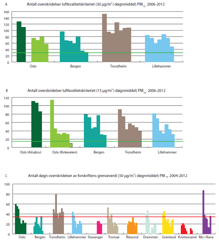 Samlet sett fastsetter Folkehelseinstituttet og Miljødirektoratet et luftkvalitetskriterium for døgnmidlet PM10 på 30 µg/m3, som er en videreføring av det nivået vi har fra tidligere, og strengere enn den nye anbefalingen fra WHO. For PM2,5 er døgnnivået fastsatt til 15 µg/m3, som er en videreføring av det nivået vi hadde fra tidligere og som også samsvarer med de nye anbefalingene fra WHO.