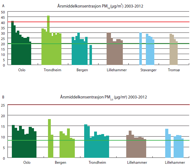 Samlet sett fastsetter Folkehelseinstituttet og Miljødirektoratet et luftkvalitetskriterium for årsmiddel av PM10 på 15 μg/m3 og PM2,5 på 5 μg/m3, som er i samsvar med anbefalingene fra WHO (2021) [120].