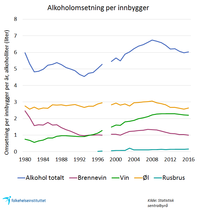 Totalomsetningen av alkohol per innbygger 15 år og eldre var relativt stabil fram til midten av 1990-tallet, men det var så en kraftig økning fram til 2008. Dette kan langt på vei tilskrives økningen i omsetning av vin. Omsetning av øl og brennevin har i 2010-årene gått noe ned. Det ga samlet sett en nedgang fra 2008 til 2014. Omsetningen var deretter igjen stabil fram til 2019.