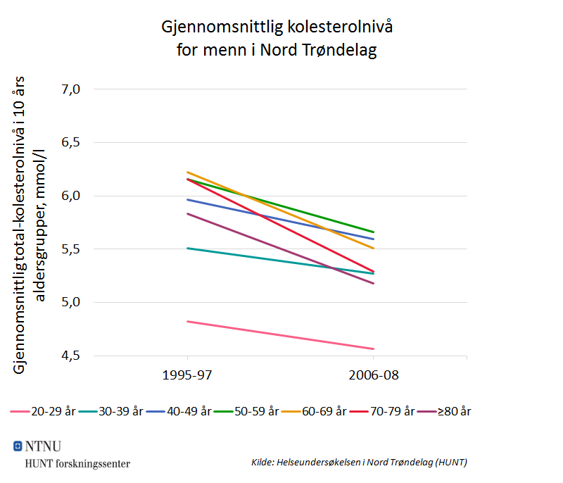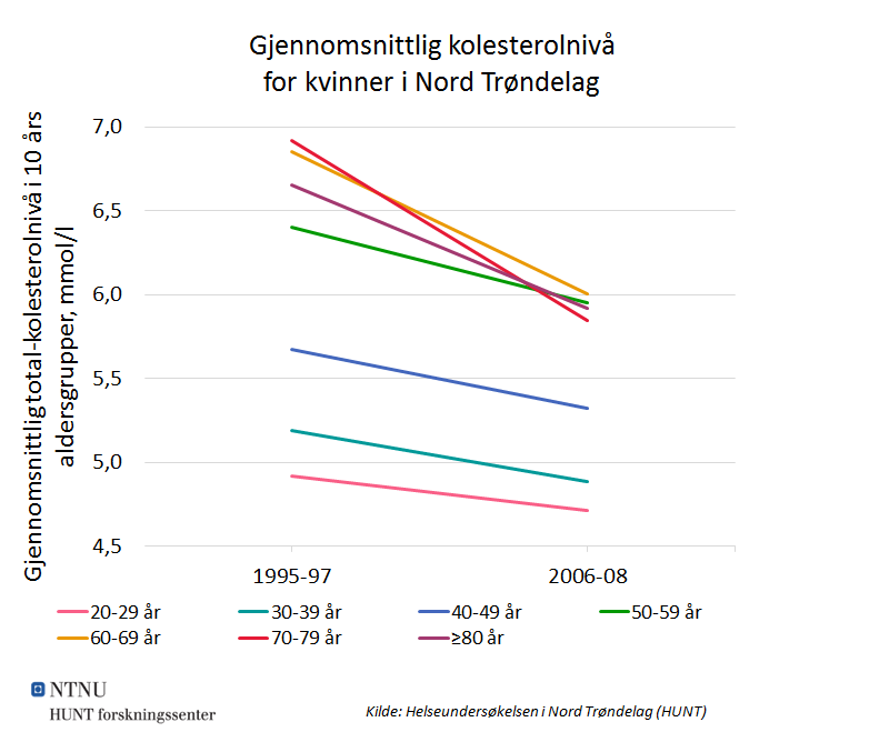 Gjennomsnittlig kolesterolnivået har gått ned i perioden 1995-2019 i alle aldersgrupper. Dette viser resultatene fra Tromsøundersøkelsen og Helseundersøkelsen i Nord Trøndelag (HUNT). I de høyere aldersgruppene er det mange som bruker kolesterolsenkende medisiner.